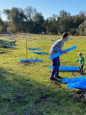Scott Williams, from Basic Resources Environmental and Land Use department developed the overall program of collecting local acorns and planting them in a natural cluster pattern with protective blue shields to protect and encourage growth. The project undertaken included Scott, plus George Reed driver, Harlan Kuntz, in conjunction with members of Boy Scout Troop 265 to plant 369 blue oak trees in Amador County. These trees serve many benefits to the environment which include providing food and shelter to over 270 wildlife species. Because the reclaimed mining area will eventually blend into the surrounding hills and oak woodlands, future generations will likely be unaware of presence of the reclaimed rock quarry.
