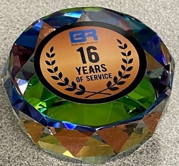 In addition to individual company logos, the sticker design includes the distinctive laurel wreath which was the prize for the winner at the ancient Olympic games. Like the Olympic prizes, increasing years of service progress from white to gold metallic color. The words on the stickers also are also reminiscent of the Reed Family Company’s S.E.R.V.I.C.E. principles. The stickers have a distinctive black border so they are readily distinguishable from other stickers worn on hard hats. Recognizing that some employees do not have hard hats, acrylic gem cut desk paperweights are available upon which to display these stickers. The Years of Service Stickers Program provides an annual opportunity to say, “Thank You for Your Service!”